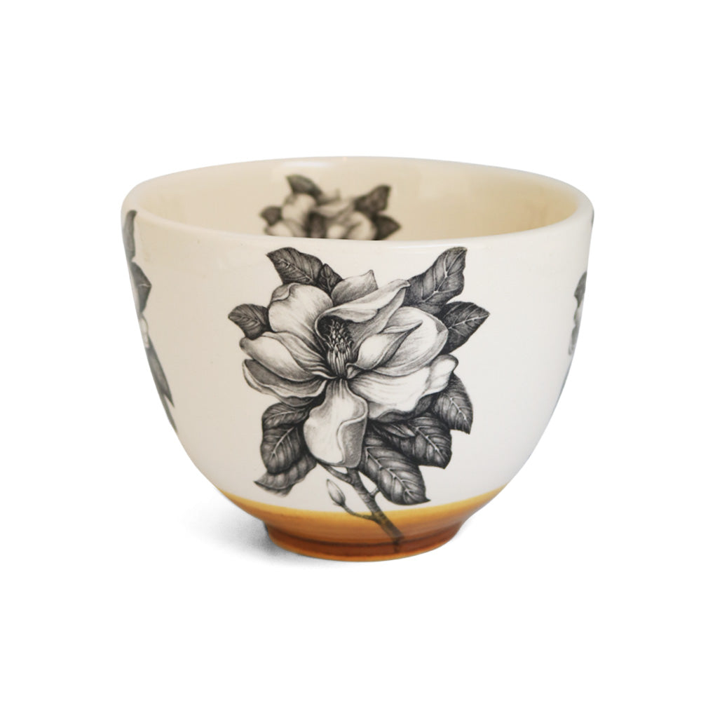 Laura Zindel's handmade tableware is fabricated with small batches of white ceramic earthenware and hand brushed with their signature glazes. The surface of each piece is then collaged with enamel transfers of Laura’s detailed graphite pencil drawings of flora and fauna. Each piece is fired 3 times to create the rich surfaces of their heirloom place settings, serving dishes and table accessories.