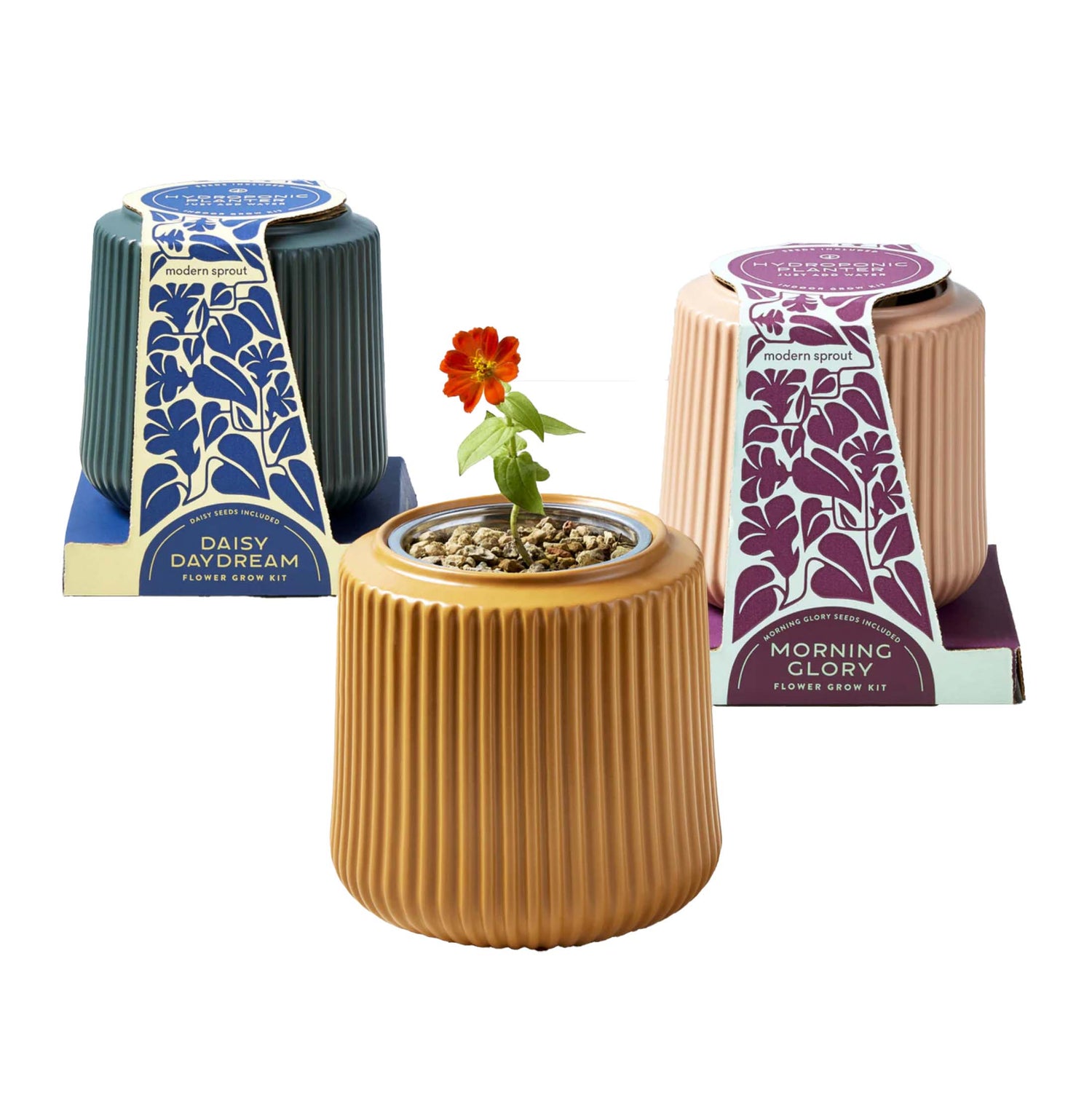 This fluted ceramic planter includes a complete grow kit with an immersion hydroponic setup that wicks water to flowers as needed. Just add water!