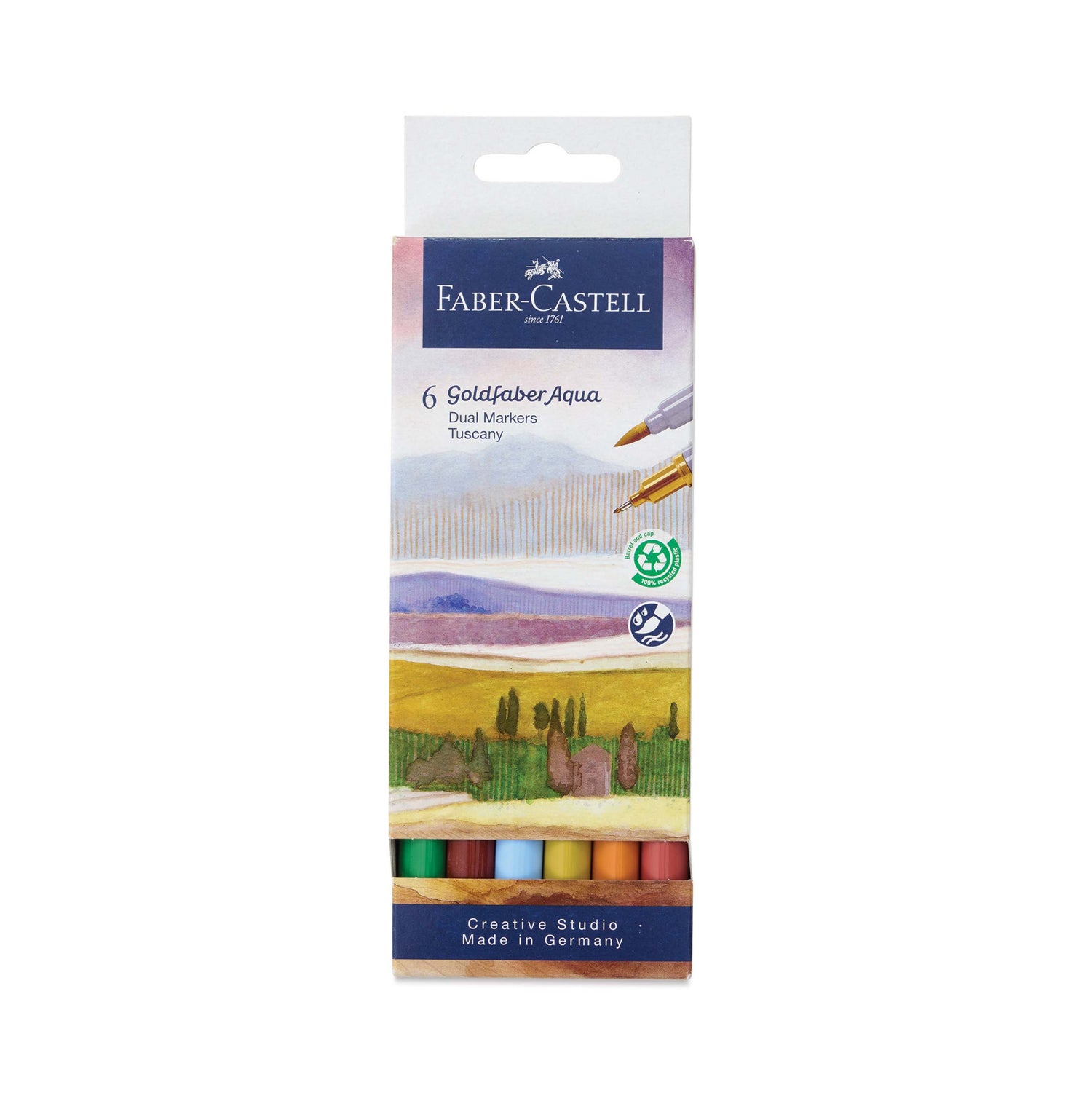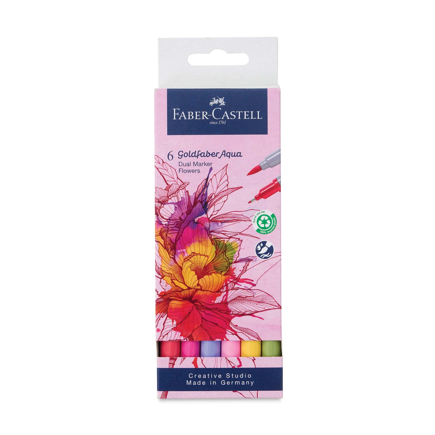 Watercolor markers are the perfect medium for calligraphy, detailed watercolor painting, dry brushing, sketching, coloring and more! The premium quality Goldfaber Aqua Dual Markers have a smooth color laydown when used wet or dry. Watercolor markers are fully water-soluble, acid-free, pH neutral, streak-free, odorless, and will not bleed through your paper. Goldfaber Aqua Dual Markers have 2 nibs: a flexible brush nib for artistic work and a fine point, hard felt nib (.6 mm) for detailing.