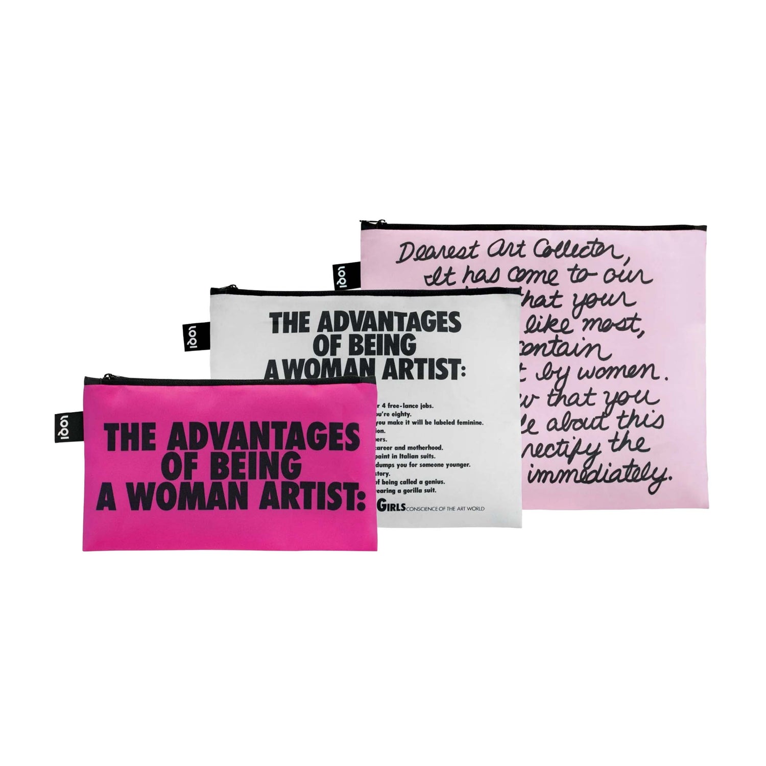 The Guerrilla Girls street posters use humor and outrageous visuals to highlight the lack of art by women in public galleries. Sneaking around in the middle of the night they paste them up in cities all over the world. Fun reading on the recycled zip pockets.