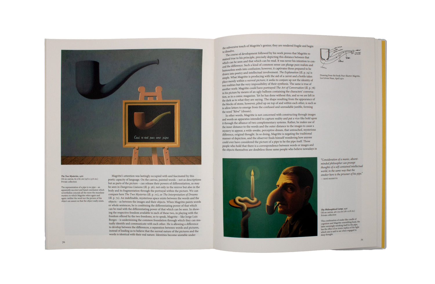 Like other Surrealist works, Magritte’s paintings combine a precise, mimetic technique with abnormal, alienating configurations which defy the laws of scale, logic, and science: a comb the size of a wardrobe, rocks that float in the sky, clouds that drift through an open door. The result is a direct yet disorientating realm, often witty, often unsettling, and always prompting us to look beyond the visible, to “what is hidden by what we see.”