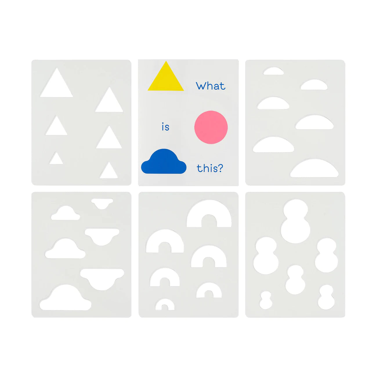 Help kids learn to see and create different objects using simple shapes with this set of six stencils. Is that a cloud or a clock? A triangle or a trumpet? A rainbow or a pair of elephant legs? Bring all these creations and more to life with stencils and an instruction booklet designed by Bastien Contraire, known for creating fanzine covers using stencil print techniques.
